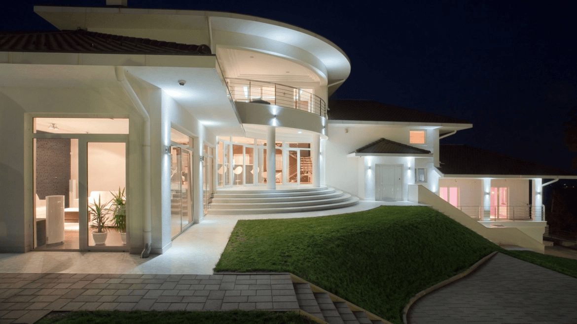 Modern luxury home glowing at night with glass walls, curved architecture, and ambient lighting. Surrounded by manicured lawn and stylish interiors, it radiates elegance, privacy, and upscale design.
