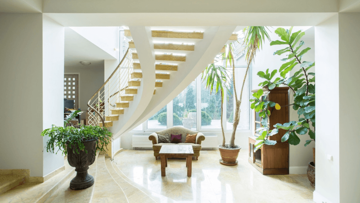Elegant interior with marble floors, curved staircase, natural light, and lush plants. A serene, modern space ideal for boutique living or creative work. Stylish, spacious, and welcoming
