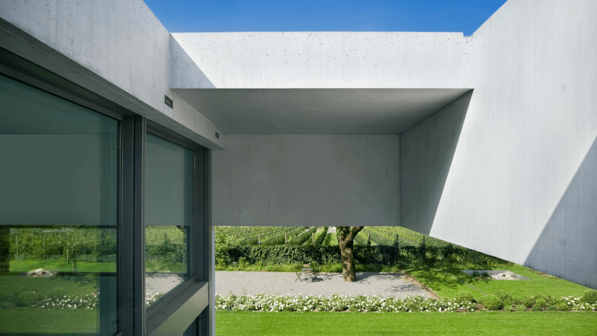 Striking modern structure with dramatic cantilevered concrete, glass walls, and garden views. A seamless blend of minimalist design and rural serenity, ideal for showcasing architectural innovation and landscape integration.