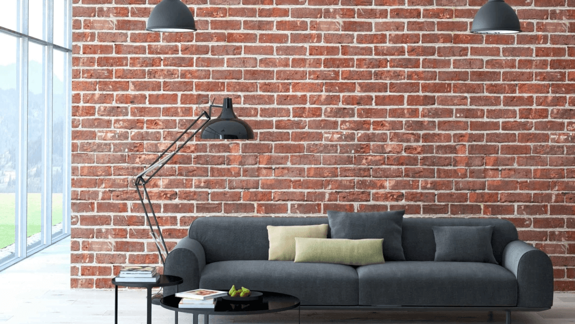 Stylish living room with exposed brick wall, soft gray sofa, and pendant lighting. Natural light and layered textures create a cozy, contemporary space perfect for relaxing or hosting guests.